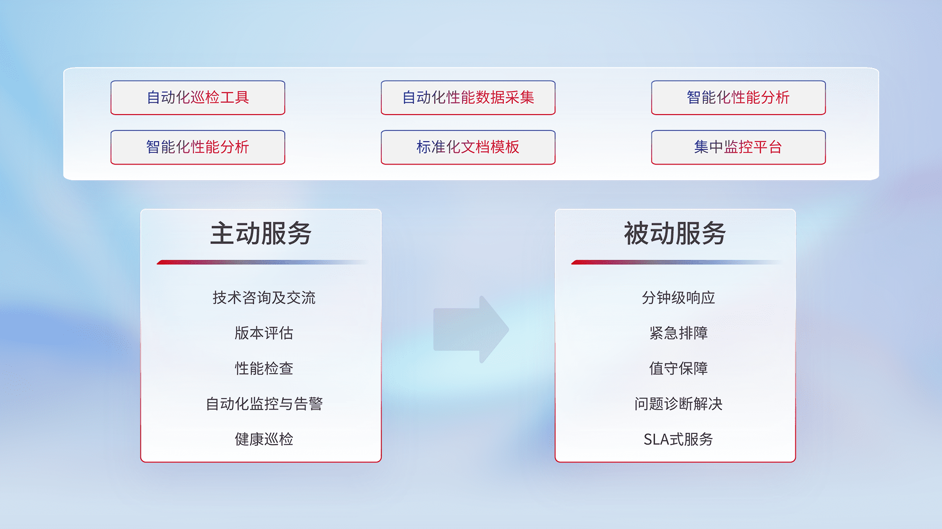 智能化工具和标准化文档,,,保障服务质量,,,提供主动服务(包含技术咨询、、、、版本评估、、、性能检查、、、、自动化监控与告警、、、、健康巡检)和被动服务包含(分钟级响应、、、紧急排障、、、、值守保障、、、问题诊断解决、、、SLA服务)。。